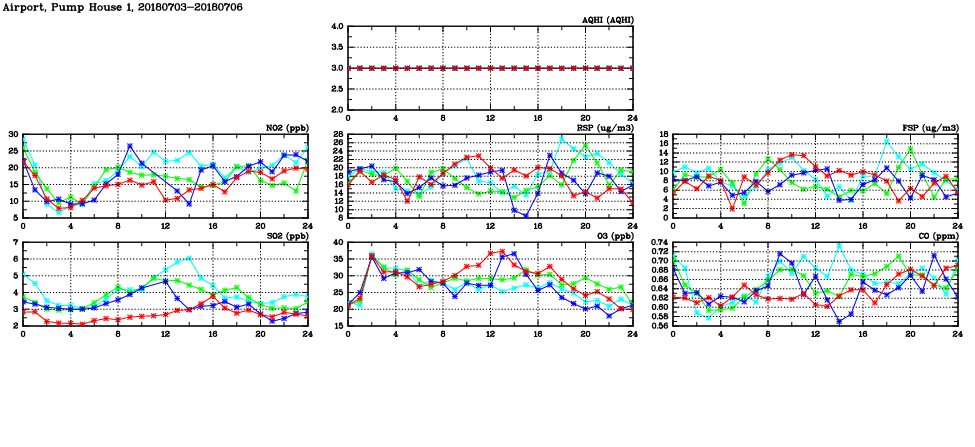 | Air Quality Data Time Series in Airport, Pump House 1 (2018/07/06) | ( Line colors: Day -3 Day -2 Day -1 Current day ) | 2D Map Current AQHI |