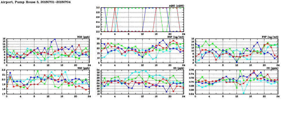 | Air Quality Data Time Series in Airport, Pump House 5 (2018/07/04) | ( Line colors: Day -3 Day -2 Day -1 Current day ) | 2D Map Current AQHI |