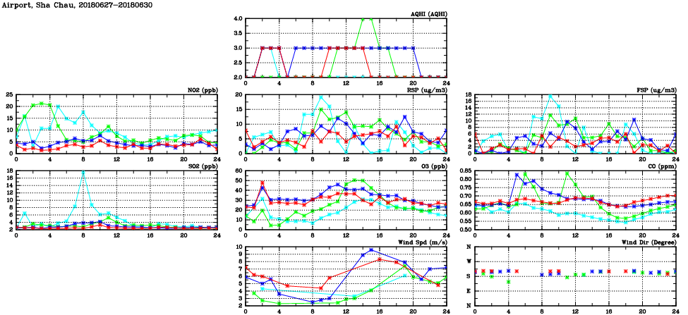 | Air Quality Data Time Series in Airport, Sha Chau (2018/06/30) | ( Line colors: Day -3 Day -2 Day -1 Current day ) | 2D Map Current AQHI |