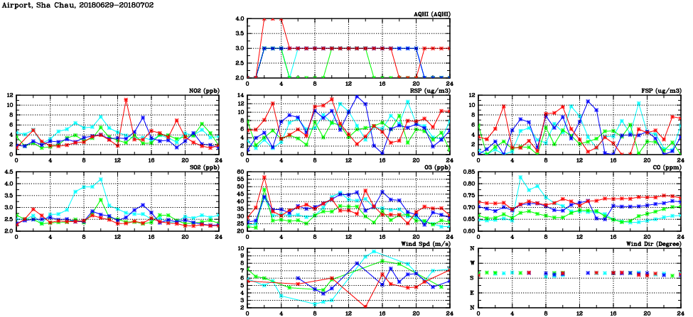 | Air Quality Data Time Series in Airport, Sha Chau (2018/07/02) | ( Line colors: Day -3 Day -2 Day -1 Current day ) | 2D Map Current AQHI |