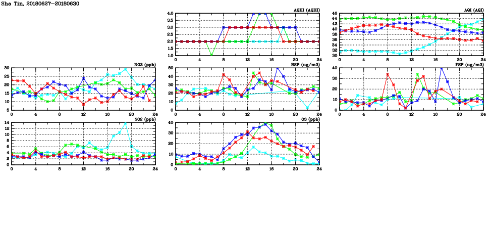 | Air Quality Data Time Series in Sha Tin (2018/06/30) | ( Line colors: Day -3 Day -2 Day -1 Current day ) | 2D Map Current AQHI |