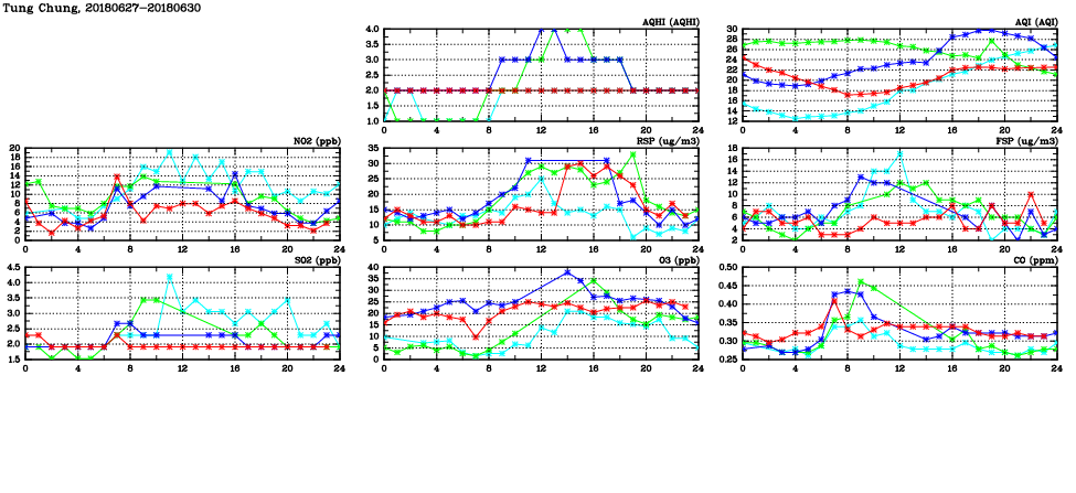 | Air Quality Data Time Series in Tung Chung (2018/06/30) | ( Line colors: Day -3 Day -2 Day -1 Current day ) | 2D Map Current AQHI |
