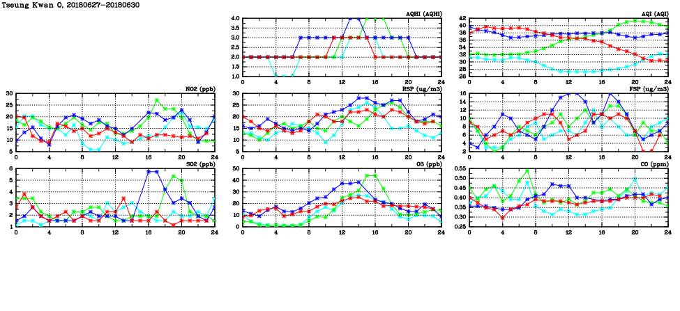 | Air Quality Data Time Series in Tseung Kwan O (2018/06/30) | ( Line colors: Day -3 Day -2 Day -1 Current day ) | 2D Map Current AQHI |