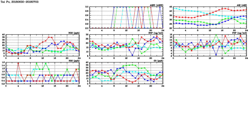 | Air Quality Data Time Series in Tai Po (2018/07/03) | ( Line colors: Day -3 Day -2 Day -1 Current day ) | 2D Map Current AQHI |