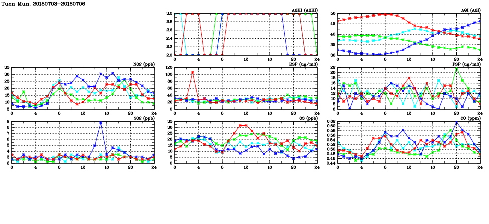 | Air Quality Data Time Series in Tuen Mun (2018/07/06) | ( Line colors: Day -3 Day -2 Day -1 Current day ) | 2D Map Current AQHI |