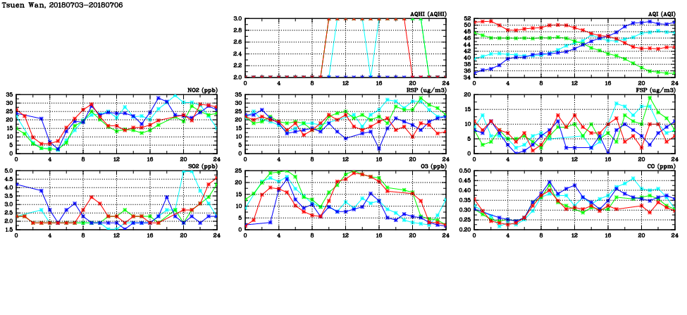 | Air Quality Data Time Series in Tsuen Wan (2018/07/06) | ( Line colors: Day -3 Day -2 Day -1 Current day ) | 2D Map Current AQHI |