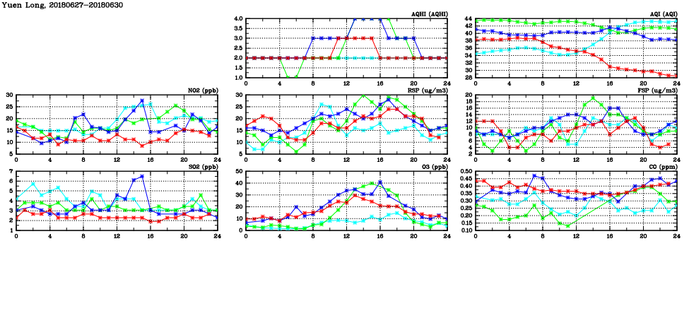 | Air Quality Data Time Series in Yuen Long (2018/06/30) | ( Line colors: Day -3 Day -2 Day -1 Current day ) | 2D Map Current AQHI |