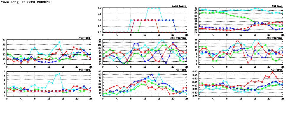 | Air Quality Data Time Series in Yuen Long (2018/07/02) | ( Line colors: Day -3 Day -2 Day -1 Current day ) | 2D Map Current AQHI |