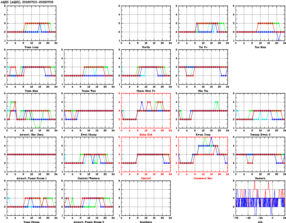 | Air Quality Data Time Series for AQHI (2018/07/06) | ( Line colors: Day -3 Day -2 Day -1 Current day ) | 2D Map Current AQHI |