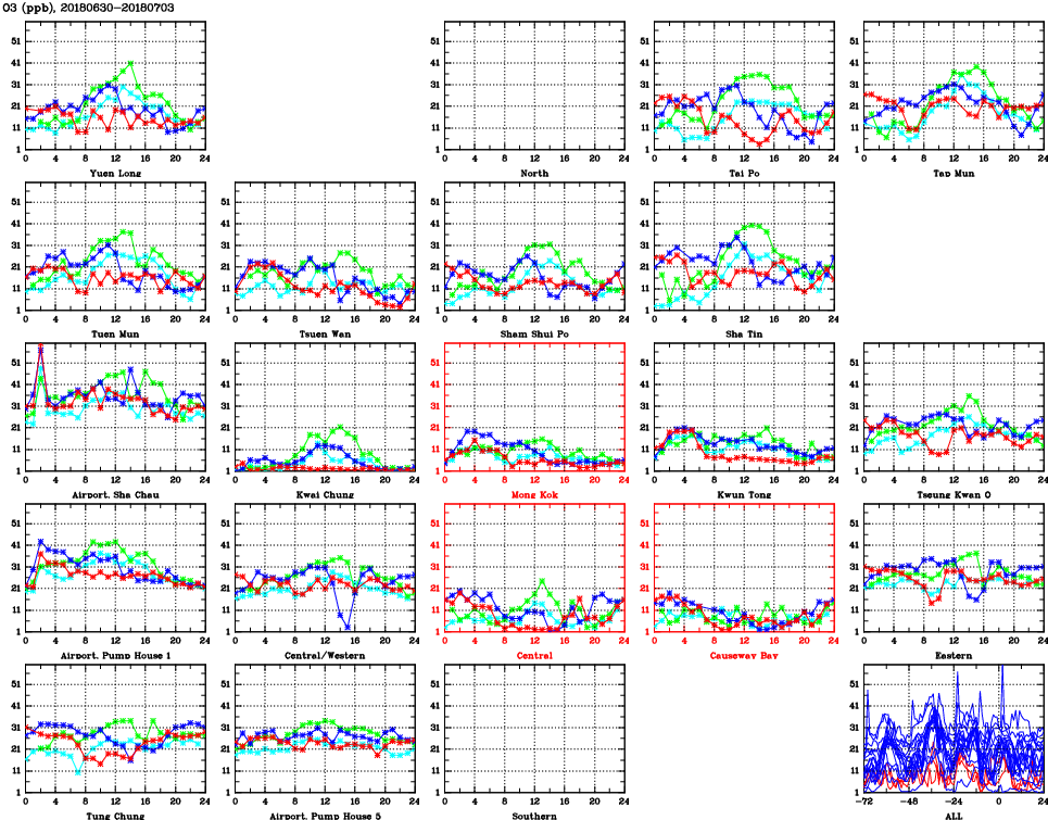 | Air Quality Data Time Series for O3 (2018/07/03) | ( Line colors: Day -3 Day -2 Day -1 Current day ) | 2D Map Current AQHI |