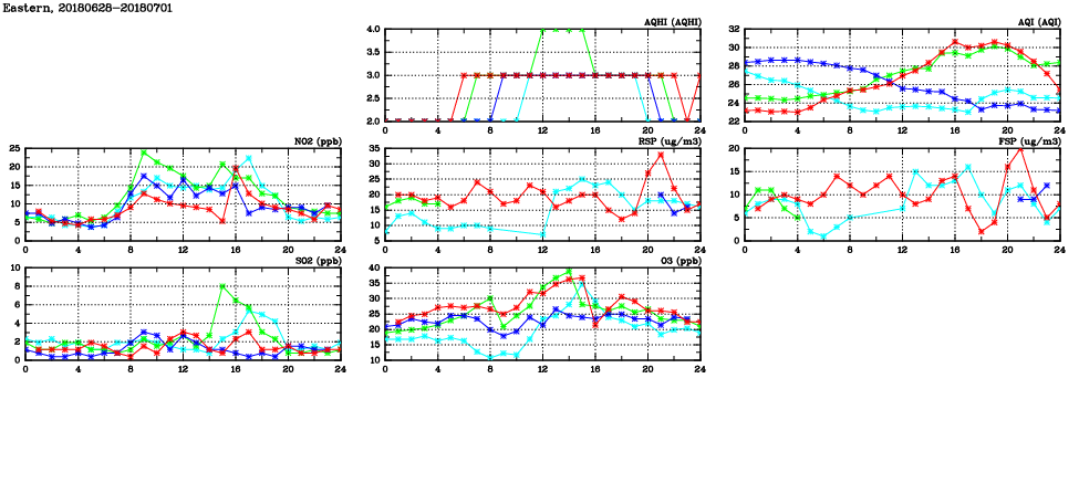 | Air Quality Data Time Series in Eastern (2018/07/01) | ( Line colors: Day -3 Day -2 Day -1 Current day ) | 2D Map Current AQHI |