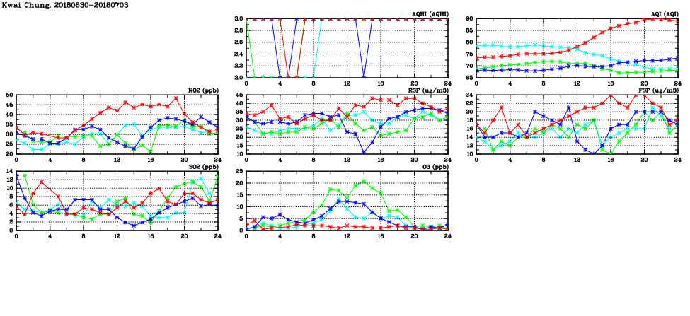 | Air Quality Data Time Series in Kwai Chung (2018/07/03) | ( Line colors: Day -3 Day -2 Day -1 Current day ) | 2D Map Current AQHI |
