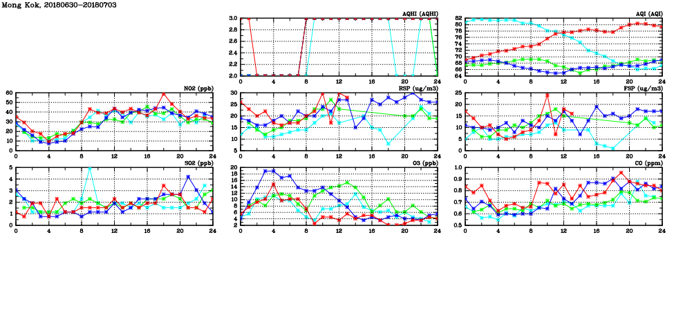 | Air Quality Data Time Series in Mong Kok (2018/07/03) | ( Line colors: Day -3 Day -2 Day -1 Current day ) | 2D Map Current AQHI |