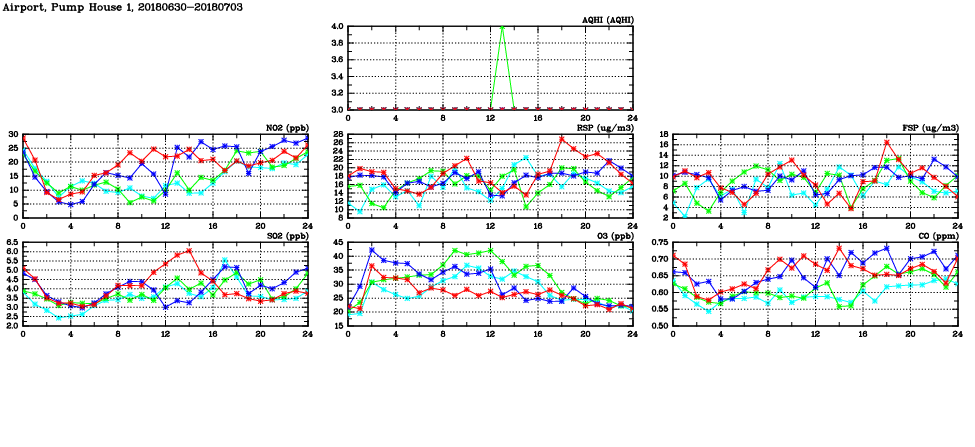 | Air Quality Data Time Series in Airport, Pump House 1 (2018/07/03) | ( Line colors: Day -3 Day -2 Day -1 Current day ) | 2D Map Current AQHI |