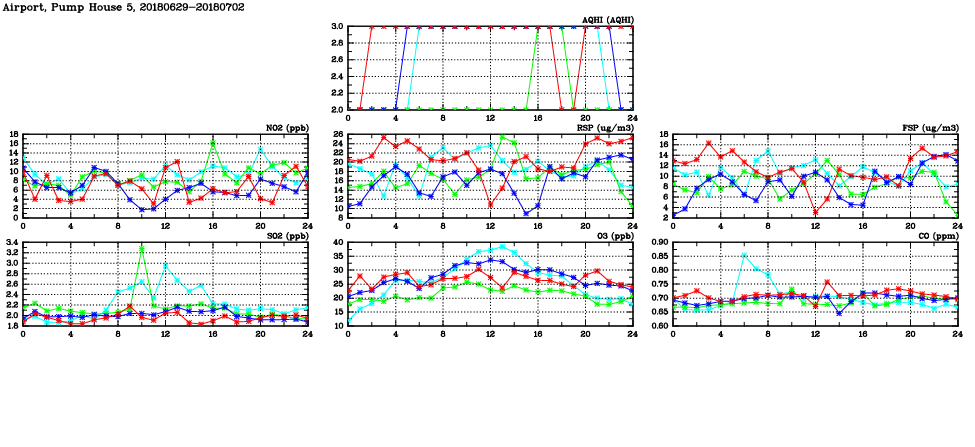 | Air Quality Data Time Series in Airport, Pump House 5 (2018/07/02) | ( Line colors: Day -3 Day -2 Day -1 Current day ) | 2D Map Current AQHI |