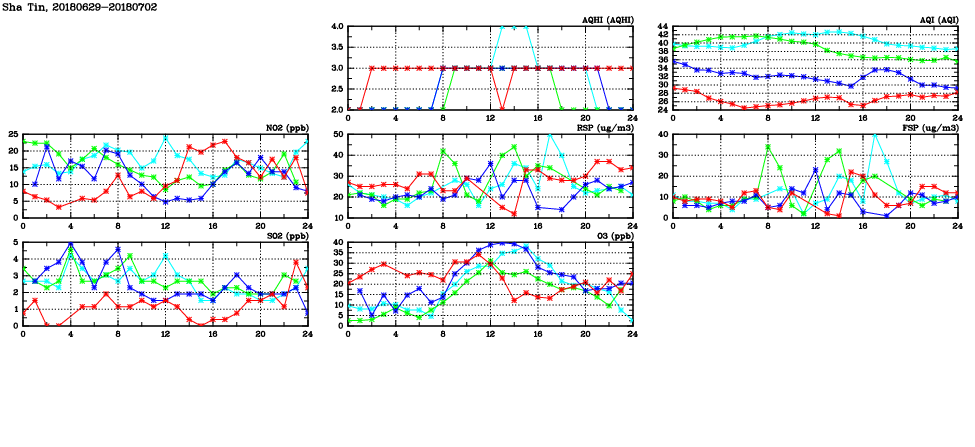 | Air Quality Data Time Series in Sha Tin (2018/07/02) | ( Line colors: Day -3 Day -2 Day -1 Current day ) | 2D Map Current AQHI |