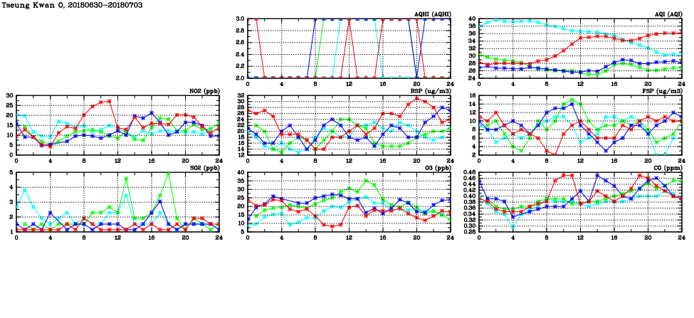 | Air Quality Data Time Series in Tseung Kwan O (2018/07/03) | ( Line colors: Day -3 Day -2 Day -1 Current day ) | 2D Map Current AQHI |