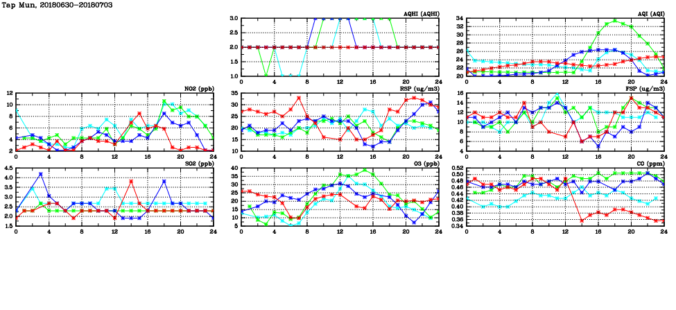 | Air Quality Data Time Series in Tap Mun (2018/07/03) | ( Line colors: Day -3 Day -2 Day -1 Current day ) | 2D Map Current AQHI |