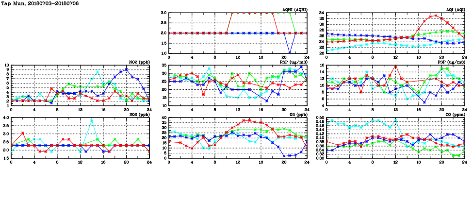 | Air Quality Data Time Series in Tap Mun (2018/07/06) | ( Line colors: Day -3 Day -2 Day -1 Current day ) | 2D Map Current AQHI |