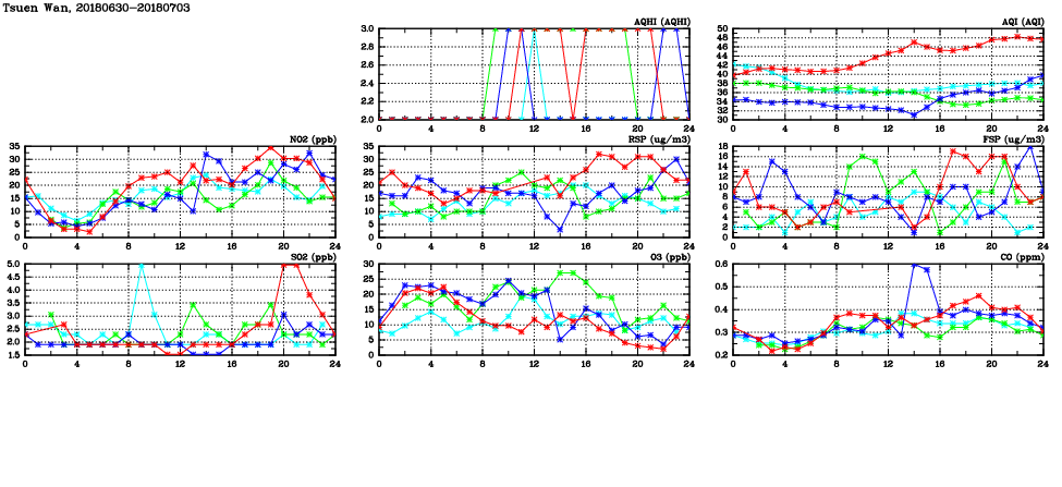| Air Quality Data Time Series in Tsuen Wan (2018/07/03) | ( Line colors: Day -3 Day -2 Day -1 Current day ) | 2D Map Current AQHI |