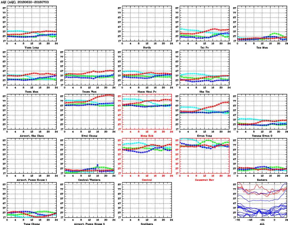 | Air Quality Data Time Series for AQI (2018/07/03) | ( Line colors: Day -3 Day -2 Day -1 Current day ) | 2D Map Current AQHI |