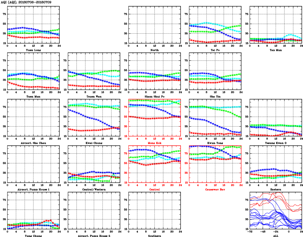 | Air Quality Data Time Series for AQI (2018/07/09) | ( Line colors: Day -3 Day -2 Day -1 Current day ) | 2D Map Current AQHI |