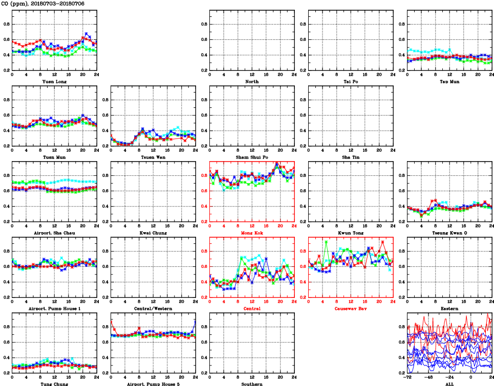 | Air Quality Data Time Series for CO (2018/07/06) | ( Line colors: Day -3 Day -2 Day -1 Current day ) | 2D Map Current AQHI |