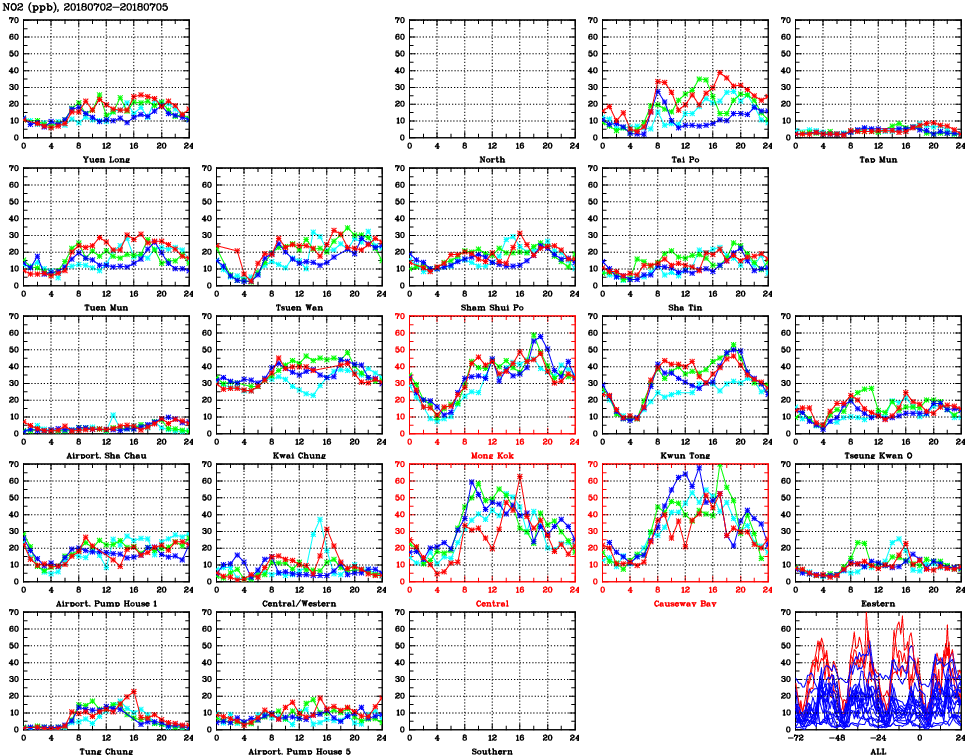 | Air Quality Data Time Series for NO2 (2018/07/05) | ( Line colors: Day -3 Day -2 Day -1 Current day ) | 2D Map Current AQHI |