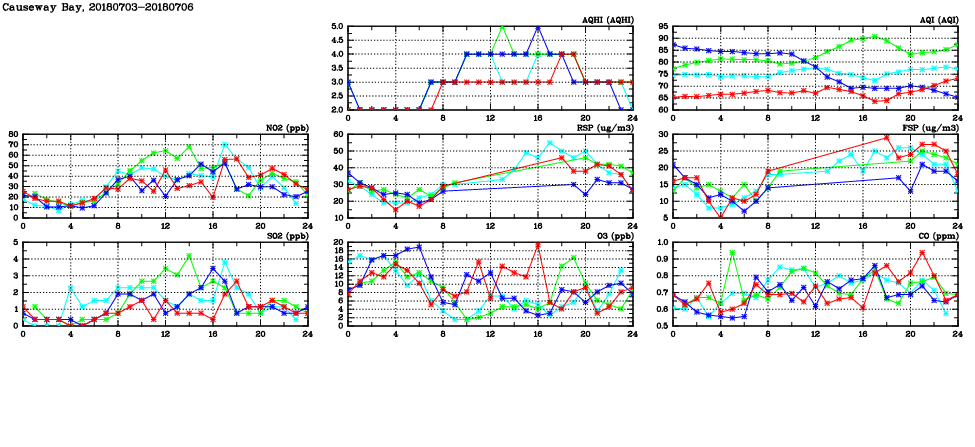 | Air Quality Data Time Series in Causeway Bay (2018/07/06) | ( Line colors: Day -3 Day -2 Day -1 Current day ) | 2D Map Current AQHI |