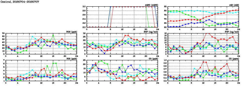 | Air Quality Data Time Series in Central (2018/07/07) | ( Line colors: Day -3 Day -2 Day -1 Current day ) | 2D Map Current AQHI |