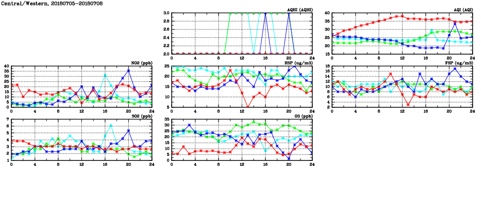 | Air Quality Data Time Series in Central/Western (2018/07/08) | ( Line colors: Day -3 Day -2 Day -1 Current day ) | 2D Map Current AQHI |