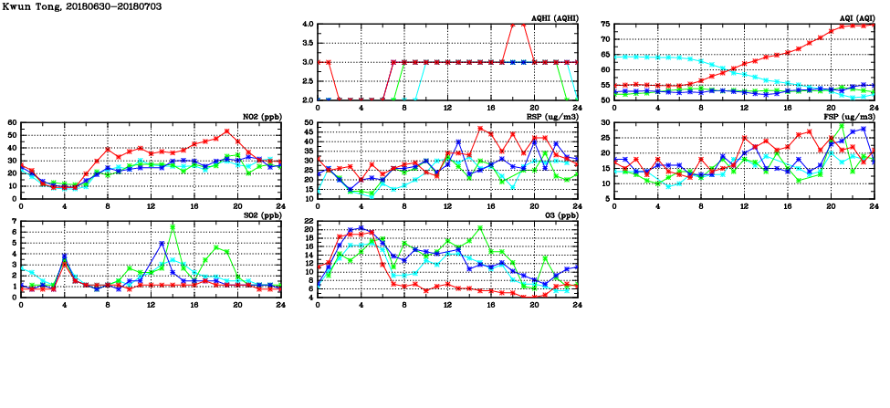 | Air Quality Data Time Series in Kwun Tong (2018/07/03) | ( Line colors: Day -3 Day -2 Day -1 Current day ) | 2D Map Current AQHI |