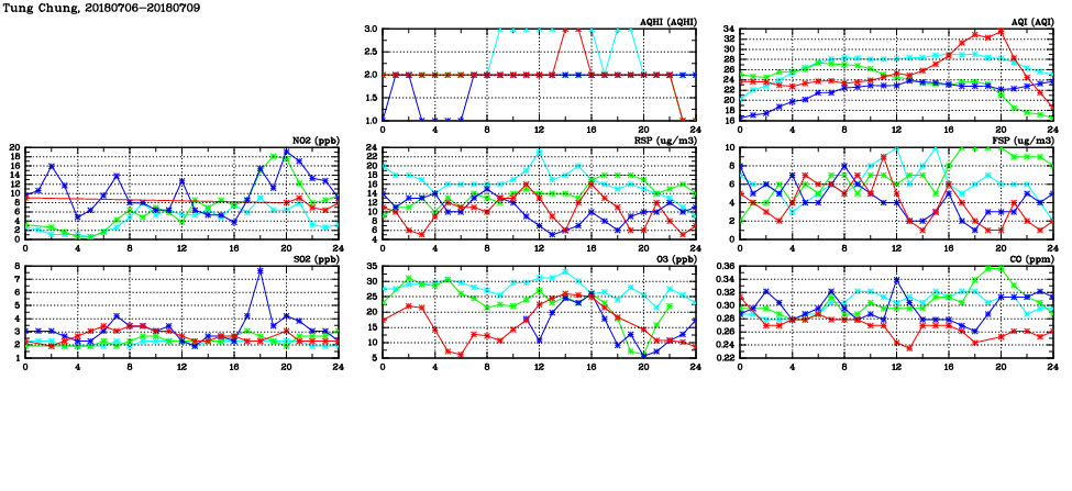 | Air Quality Data Time Series in Tung Chung (2018/07/09) | ( Line colors: Day -3 Day -2 Day -1 Current day ) | 2D Map Current AQHI |