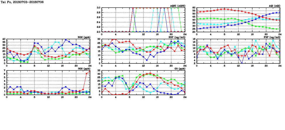 | Air Quality Data Time Series in Tai Po (2018/07/06) | ( Line colors: Day -3 Day -2 Day -1 Current day ) | 2D Map Current AQHI |