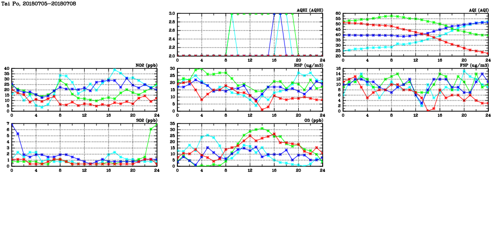 | Air Quality Data Time Series in Tai Po (2018/07/08) | ( Line colors: Day -3 Day -2 Day -1 Current day ) | 2D Map Current AQHI |
