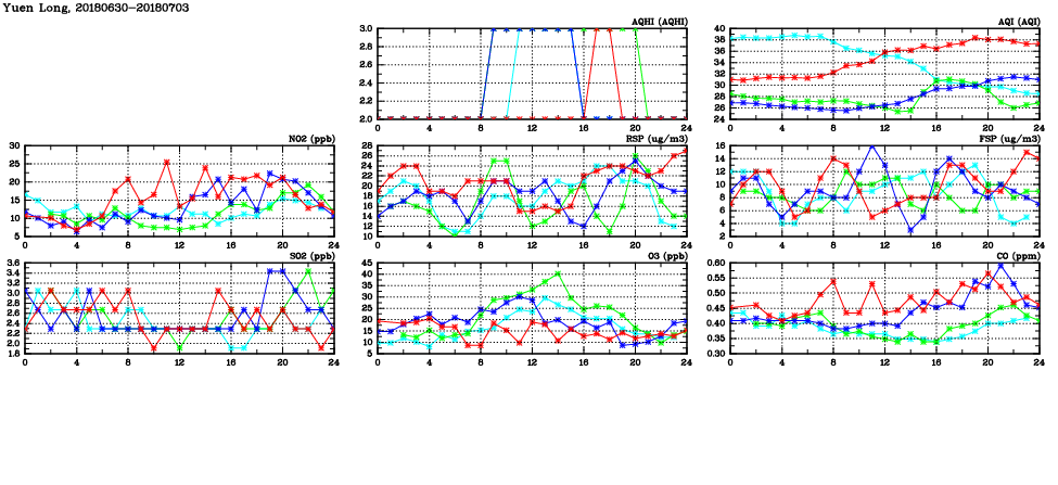 | Air Quality Data Time Series in Yuen Long (2018/07/03) | ( Line colors: Day -3 Day -2 Day -1 Current day ) | 2D Map Current AQHI |