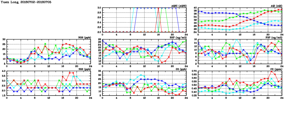 | Air Quality Data Time Series in Yuen Long (2018/07/05) | ( Line colors: Day -3 Day -2 Day -1 Current day ) | 2D Map Current AQHI |