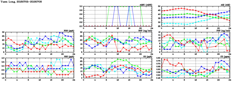 | Air Quality Data Time Series in Yuen Long (2018/07/08) | ( Line colors: Day -3 Day -2 Day -1 Current day ) | 2D Map Current AQHI |