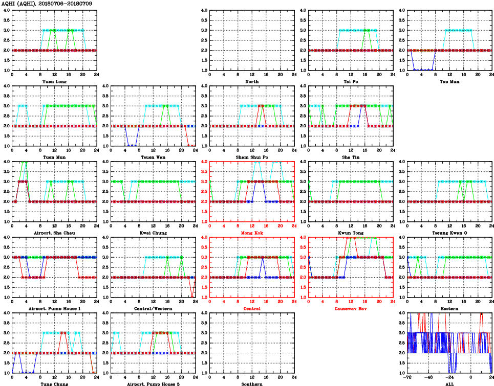 | Air Quality Data Time Series for AQHI (2018/07/09) | ( Line colors: Day -3 Day -2 Day -1 Current day ) | 2D Map Current AQHI |