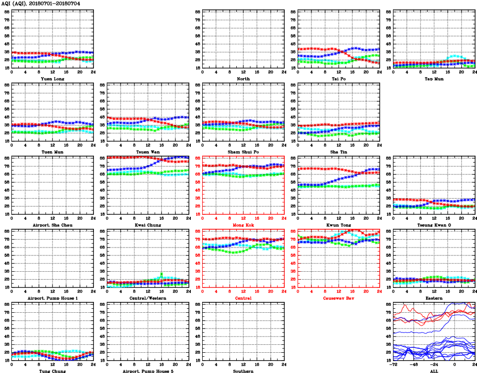 | Air Quality Data Time Series for AQI (2018/07/04) | ( Line colors: Day -3 Day -2 Day -1 Current day ) | 2D Map Current AQHI |