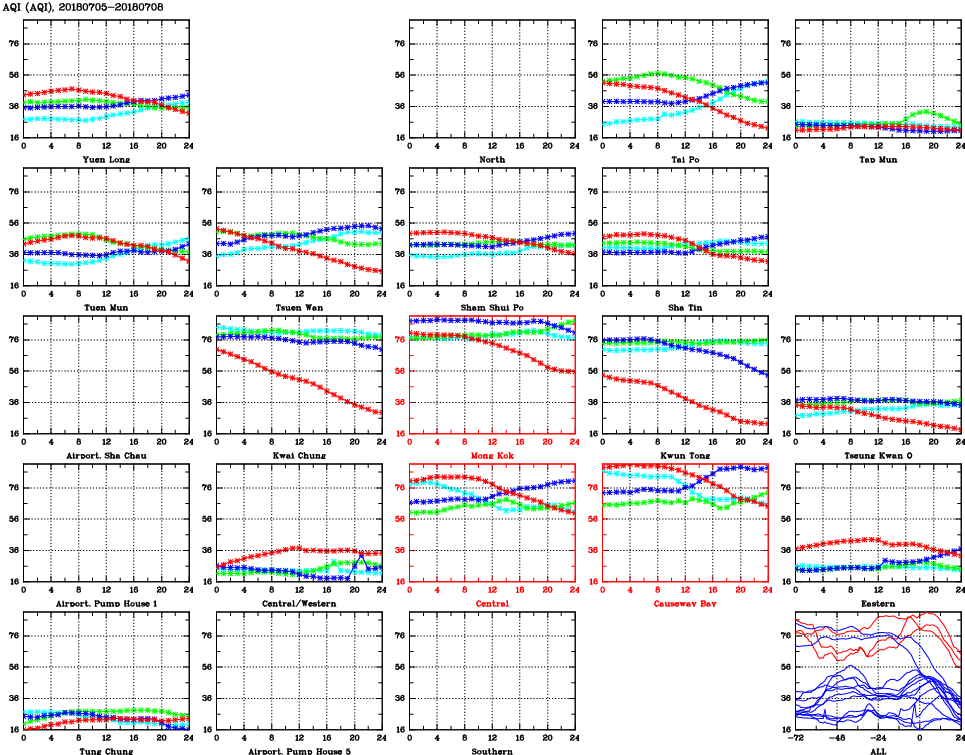 | Air Quality Data Time Series for AQI (2018/07/08) | ( Line colors: Day -3 Day -2 Day -1 Current day ) | 2D Map Current AQHI |