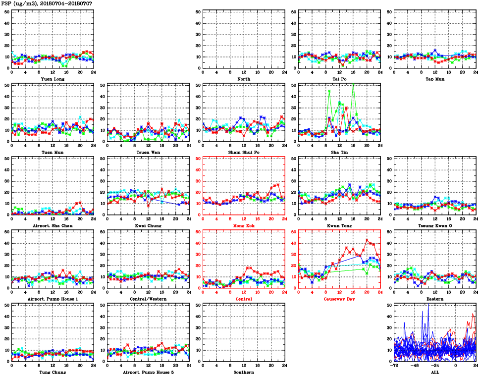 | Air Quality Data Time Series for FSP (2018/07/07) | ( Line colors: Day -3 Day -2 Day -1 Current day ) | 2D Map Current AQHI |