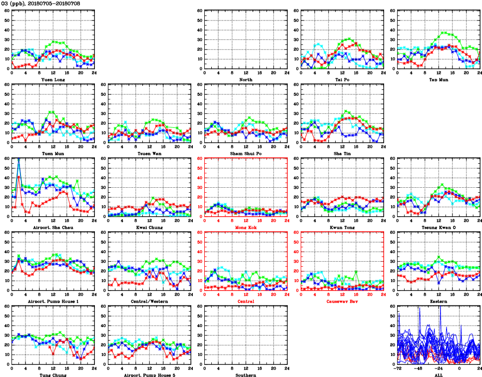 | Air Quality Data Time Series for O3 (2018/07/08) | ( Line colors: Day -3 Day -2 Day -1 Current day ) | 2D Map Current AQHI |