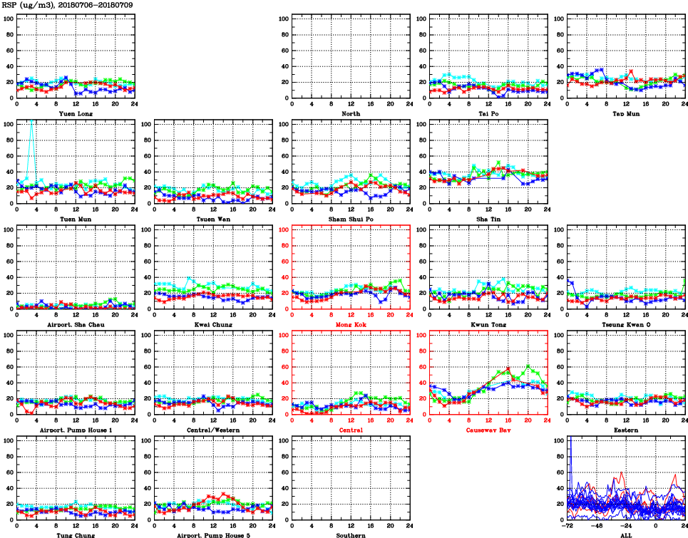 | Air Quality Data Time Series for RSP (2018/07/09) | ( Line colors: Day -3 Day -2 Day -1 Current day ) | 2D Map Current AQHI |