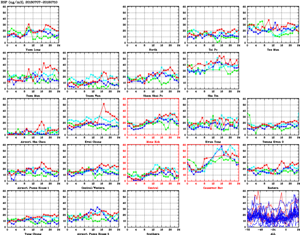 | Air Quality Data Time Series for RSP (2018/07/10) | ( Line colors: Day -3 Day -2 Day -1 Current day ) | 2D Map Current AQHI |