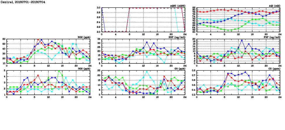 | Air Quality Data Time Series in Central (2018/07/04) | ( Line colors: Day -3 Day -2 Day -1 Current day ) | 2D Map Current AQHI |