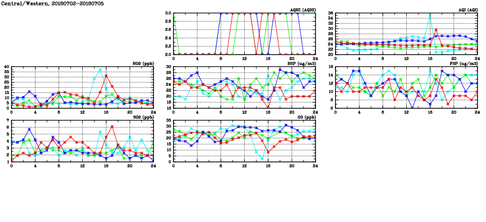 | Air Quality Data Time Series in Central/Western (2018/07/05) | ( Line colors: Day -3 Day -2 Day -1 Current day ) | 2D Map Current AQHI |