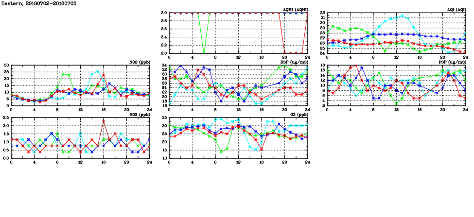 | Air Quality Data Time Series in Eastern (2018/07/05) | ( Line colors: Day -3 Day -2 Day -1 Current day ) | 2D Map Current AQHI |