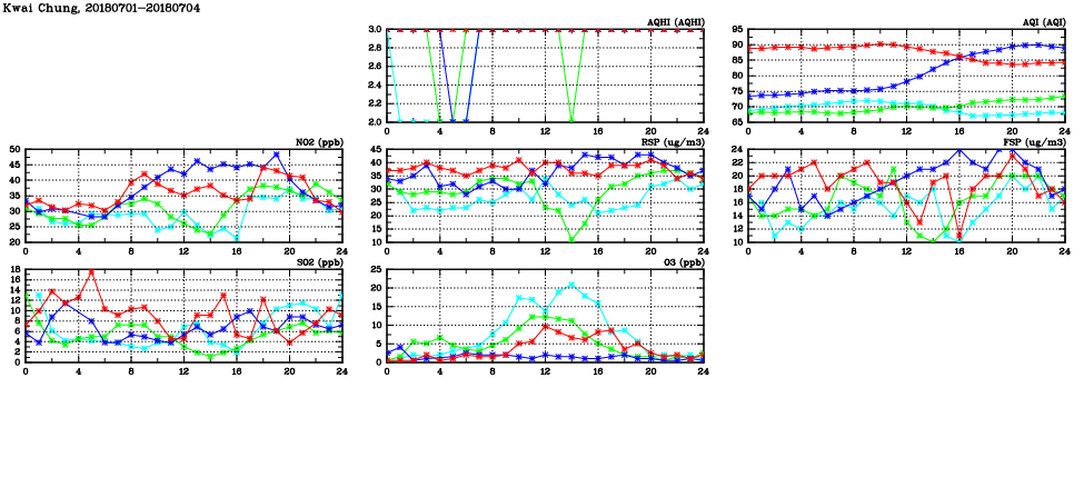| Air Quality Data Time Series in Kwai Chung (2018/07/04) | ( Line colors: Day -3 Day -2 Day -1 Current day ) | 2D Map Current AQHI |