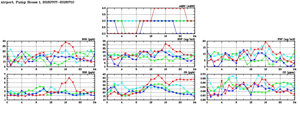 | Air Quality Data Time Series in Airport, Pump House 1 (2018/07/10) | ( Line colors: Day -3 Day -2 Day -1 Current day ) | 2D Map Current AQHI |
